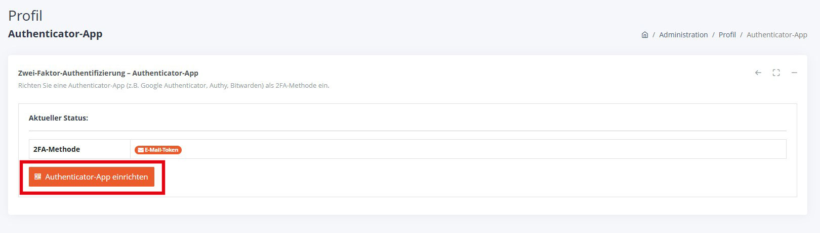 - Auf der Seite „Authenticator-App" siehst du die aktuell aktive 2FA-Methode.