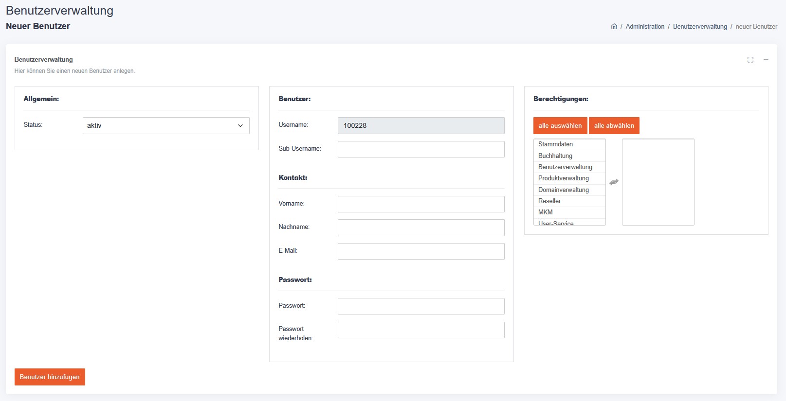 Die auswählbaren Berechtigungen richten sich nach dem Typ des neuen Benutzers und sind auf die Berechtigungen des Masterkontos beschränkt. Über „alle auswählen" / „alle abwählen" lassen sich alle Optionen auf einmal setzen.