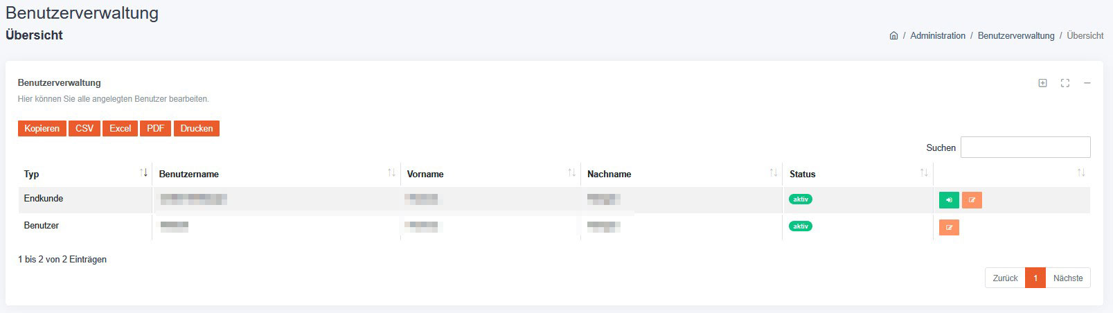 | Typ | Benutzertyp (Administrator / Benutzer / Endkunde) |