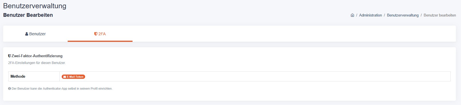 Ermöglicht die Verwaltung der Zwei-Faktor-Authentifizierung des Benutzers (TOTP zurücksetzen / deaktivieren) durch einen Administrator.
