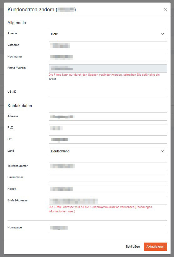 | „Die Kundendaten wurden geändert. Die Änderung muss aber noch durch den Support bestätigt werden." | Änderungsantrag wurde erfolgreich übermittelt. |