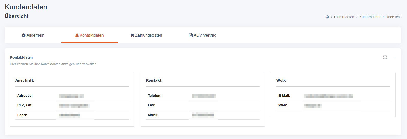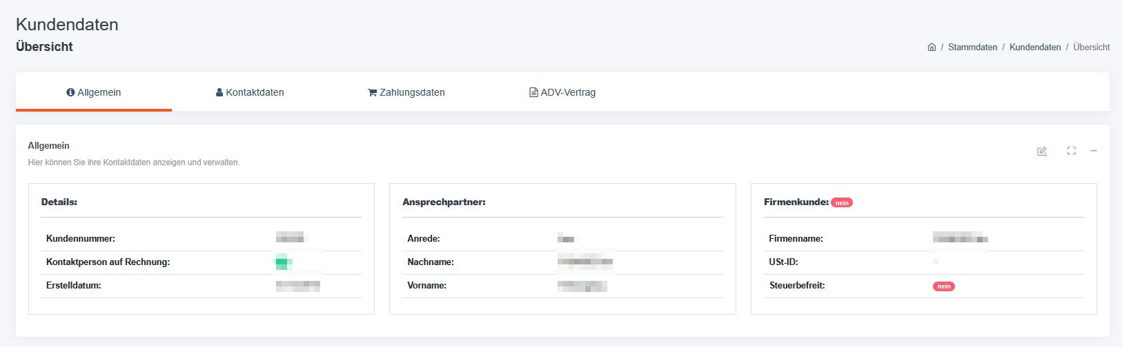 Unter Stammdaten → Kundendaten findest du alle hinterlegten Informationen zu deinem Kundenkonto. Die Seite ist in vier Bereiche (Tabs) aufgeteilt: