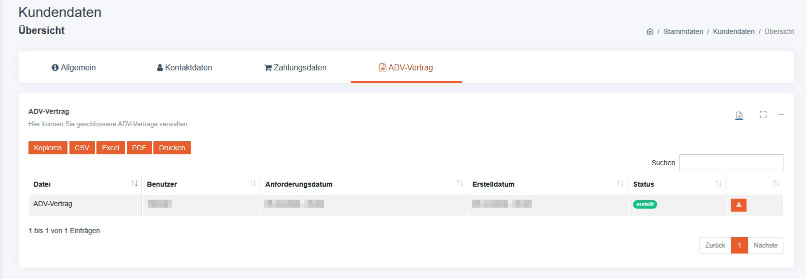 - Sobald der Support den Vertrag erstellt hat, wechselt der Status auf „erstellt" und ein Download-Button erscheint.