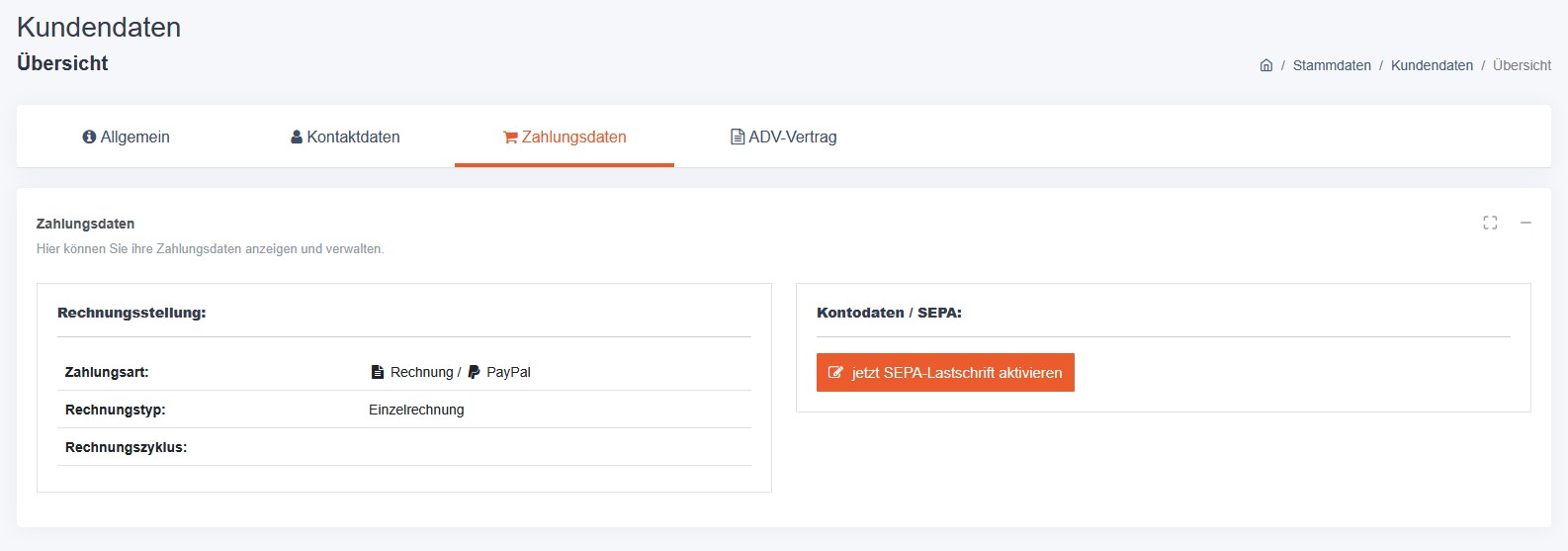 | Zahlungsdaten | Zahlungsart, Rechnungstyp, SEPA-Bankdaten |